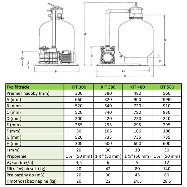 Výstupy na nalepenie k bazénovým trubkám alebo hadiciam 1/1/2“ / 50 mm /. Filtračné čerpadlo má vstavaný kôš na hrubé nečistoty a priehľadné čistiace viečko. Odporúčaná náplň FILTRAČNÉ SKLO.