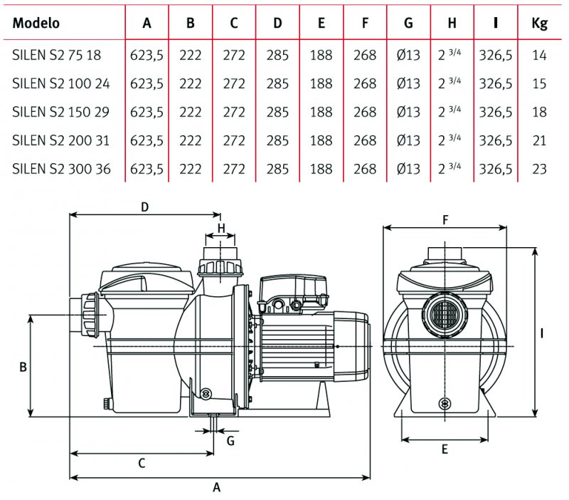 Samonasávacie čerpadlo SILEN S2 má celoplasovú čerpadlovú časť a povrchovo upravenú hliníkovú skrinku motora. Hriadel je vytvorený z nerezovej ocele AISI 420 a zatesnená grafitovou mechanickou zátkov. Typ SILEN S2 je určený pre bazény s napojením d63/63.