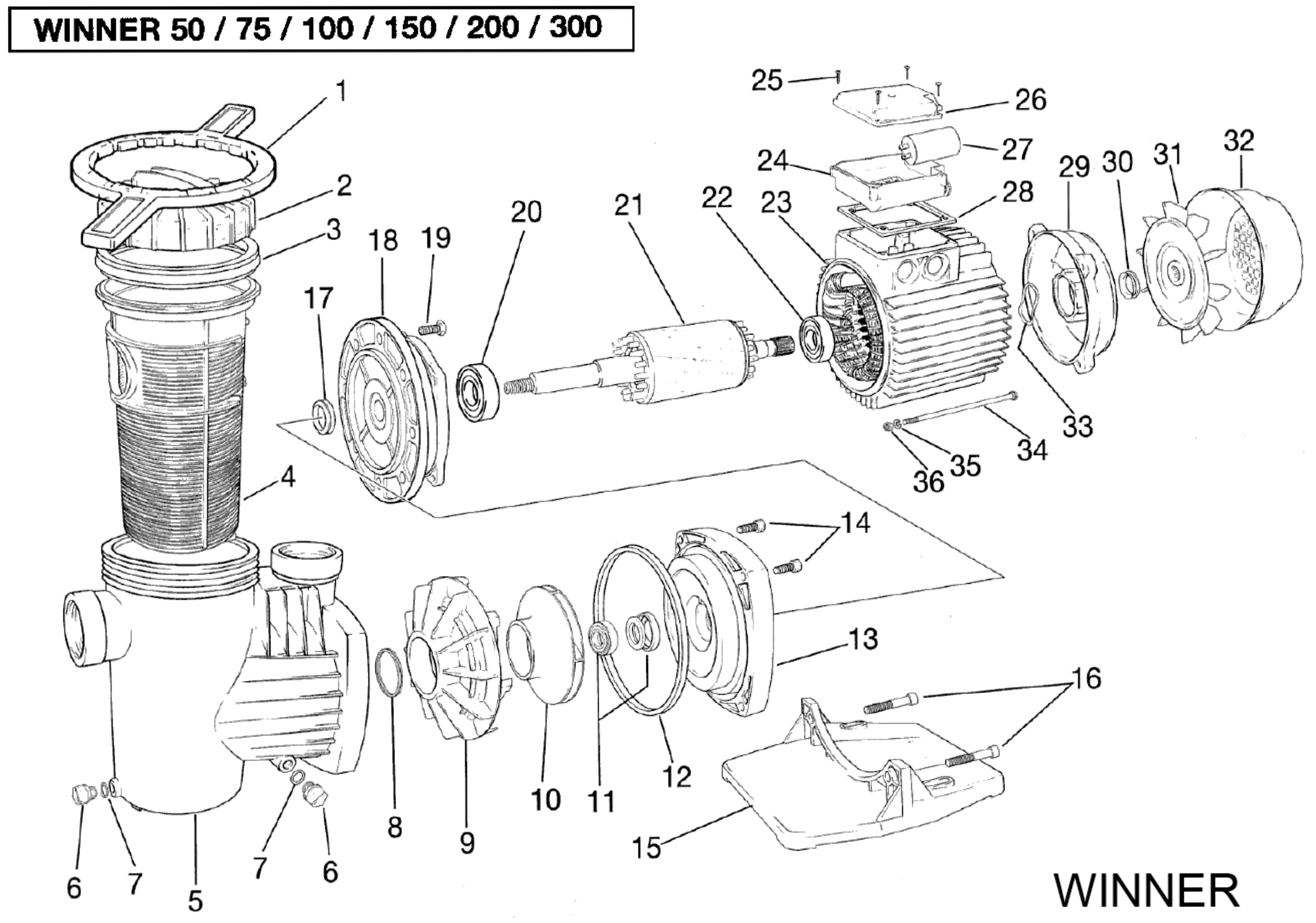Samonasávacie čerpadlo Winner 300 M s veľkokapacitným predfiltrom. Každý vyrobený kus je testovaný (má svoj evidenčný "rodný list", v ktorom sú namerané technické údaje priložené ku zadnej strane návodu). Vďaka telu čerpadla a difúzoru z polypropylénu, ktorý je zosilnený skleným vlákom, má čerpadlo nadštandardnú životnosť. Kľúč s úchytom pre obe ruky zaisťuje jednoduché povolenie a utiahnutie priehľadného veka predfiltra. Tesnenie je nasadené priamo na košíku veľkokapacitného predfiltra, čím sa zabezpečuje jeho dokonalé utesnenie.