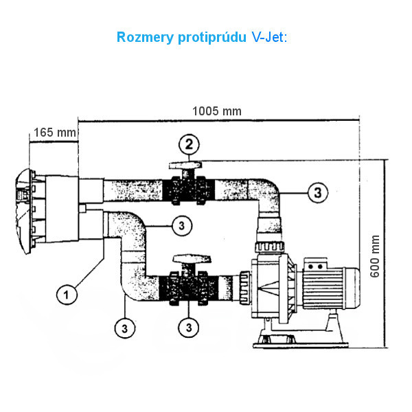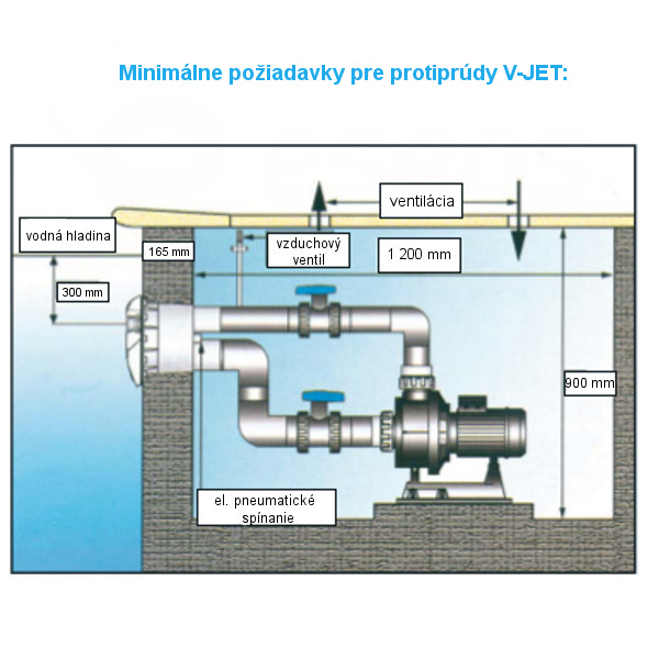 Kompletný bazénový protiprúd V Jet sa skladá z čelného panela s tryskou 40 mm a prisávaním vzduchu, pneumatického spínača protiprúdu, guľových ventilov, čerpadla s výkonom 66 m3 a napájacej skrinky. Bazénový protiprúd V Jet je určený pre pevné zabudovanie do steny bazéna.